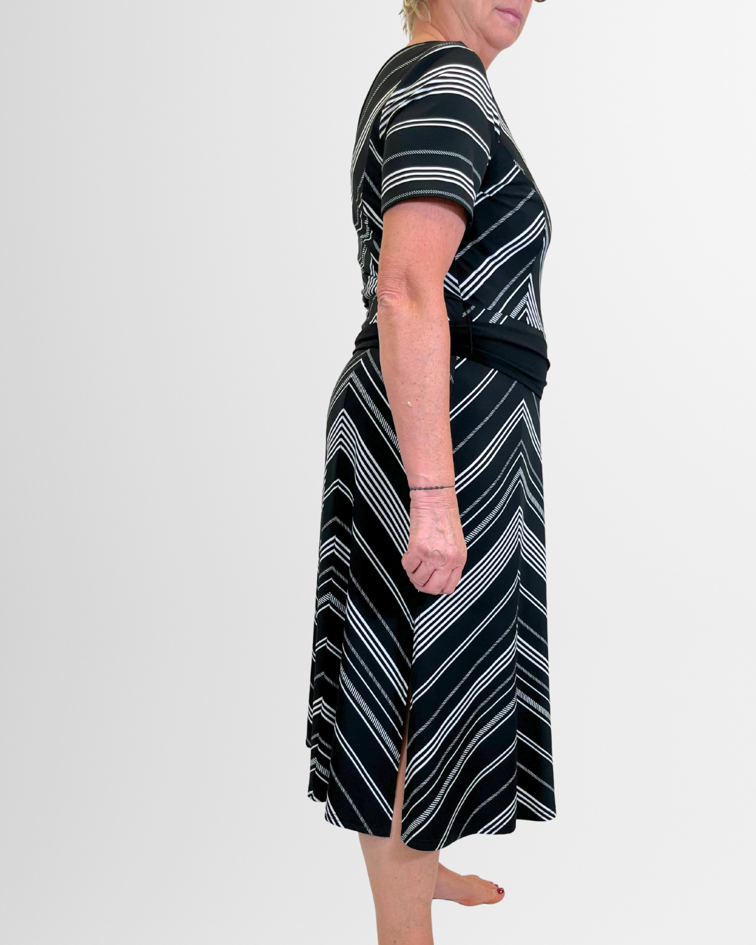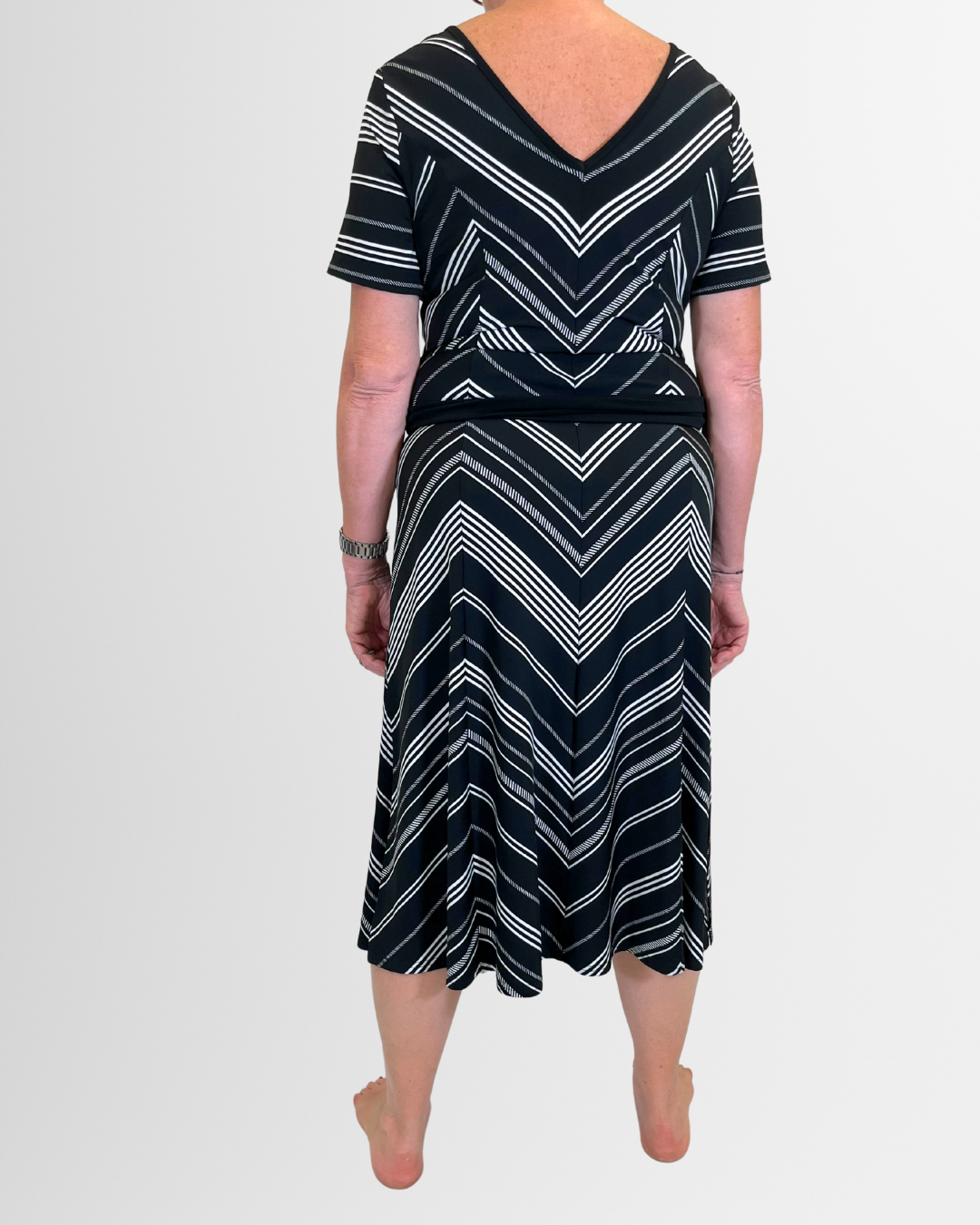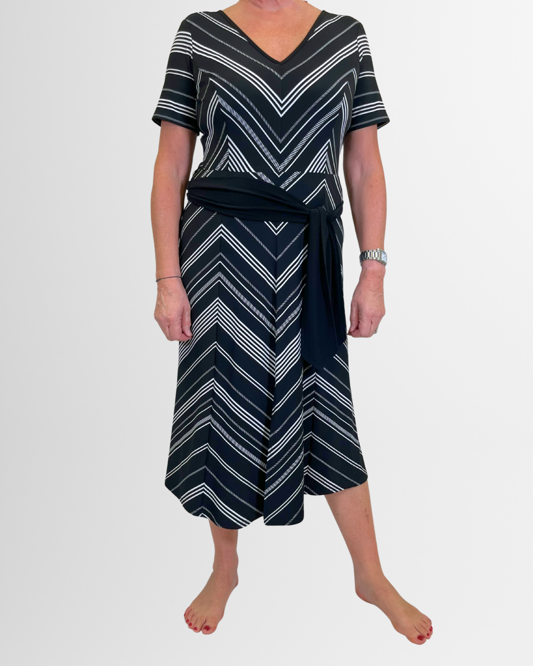 Abito a fantasia bianco e nero con scollo a V e cintura in vita. Elegante e slanciato, ideale per look da giorno o eventi speciali.