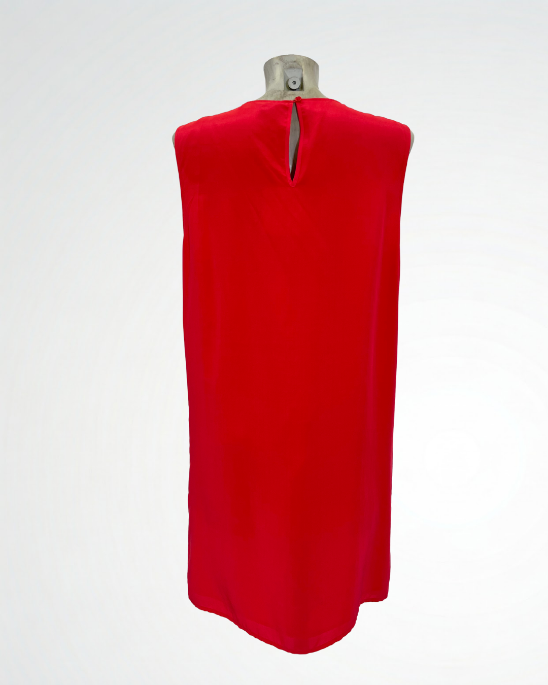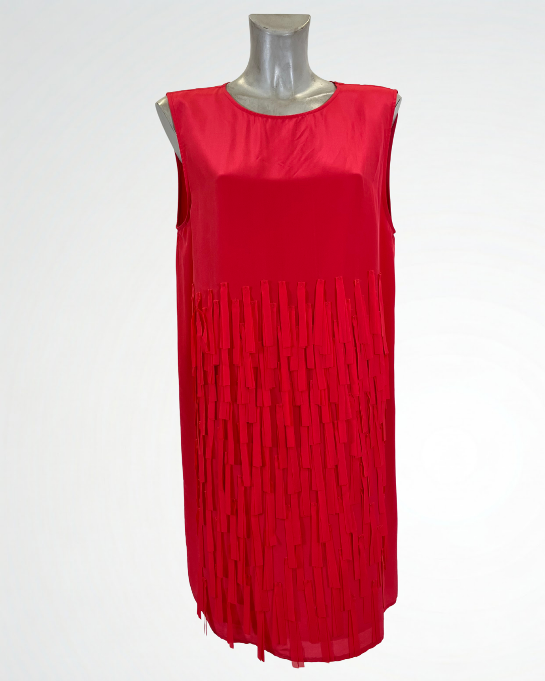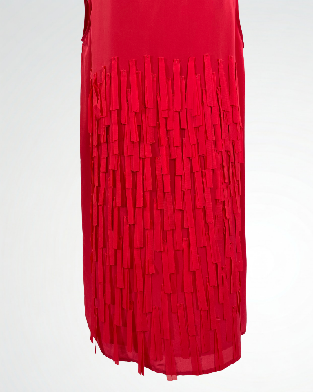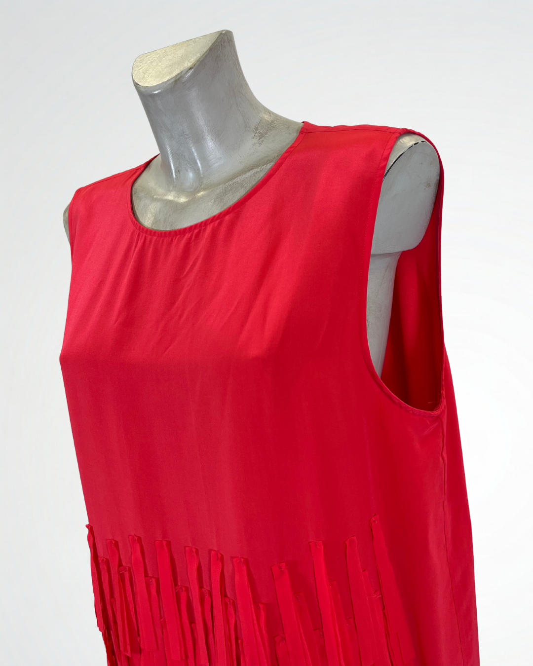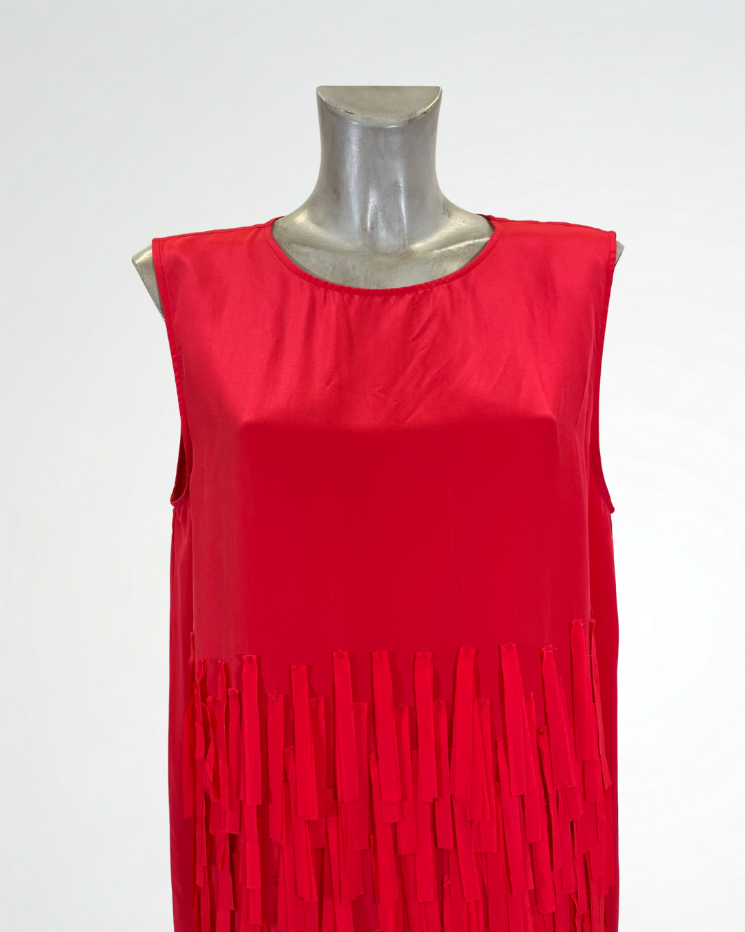 Abito midi senza maniche con dettagli a frange sul davanti. Chiusura con bottone dietro al collo e sottoveste integrata per un look elegante e dinamico.