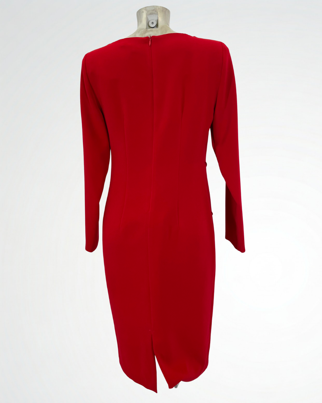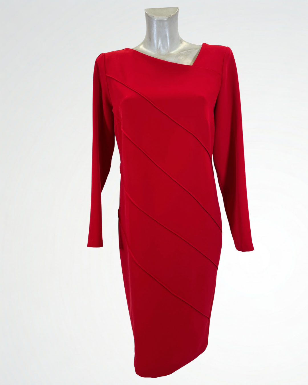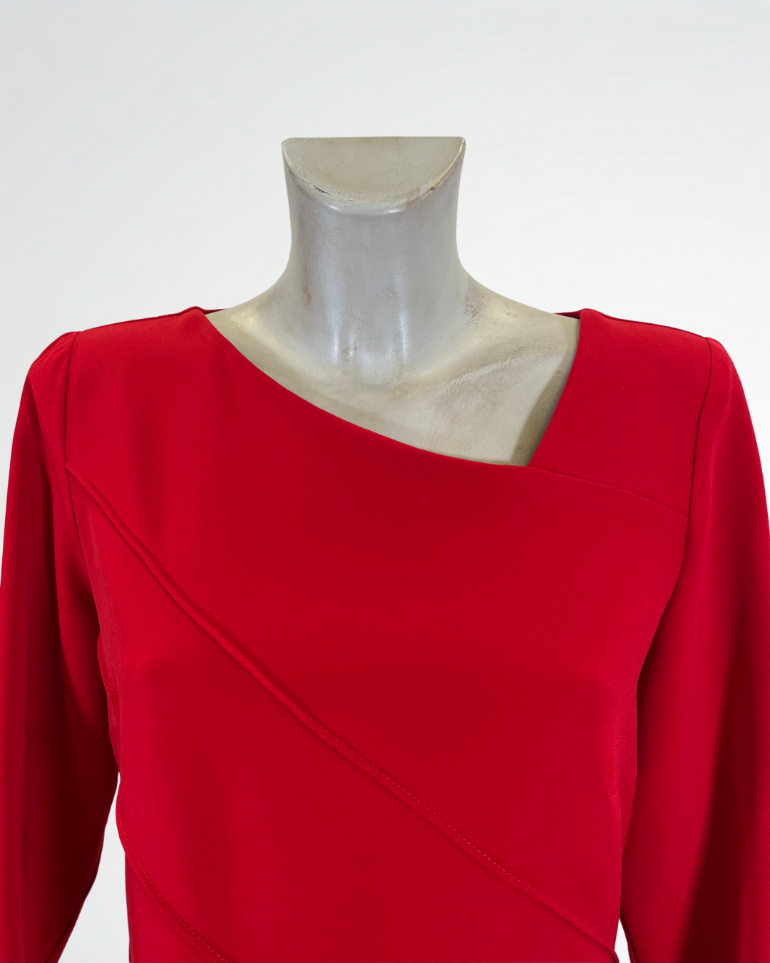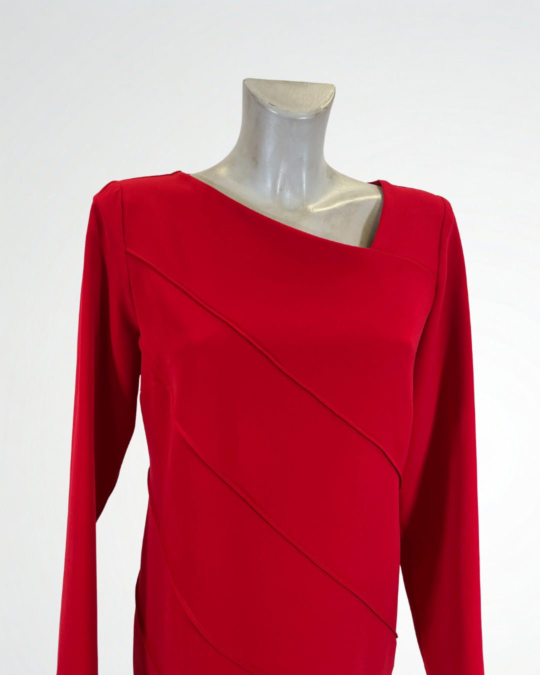 Abito midi tubino con maniche lunghe e scollo asimmetrico. Caratterizzato da dettagli cuciture sul davanti e cerniera sul retro, valorizza la silhouette con eleganza moderna.