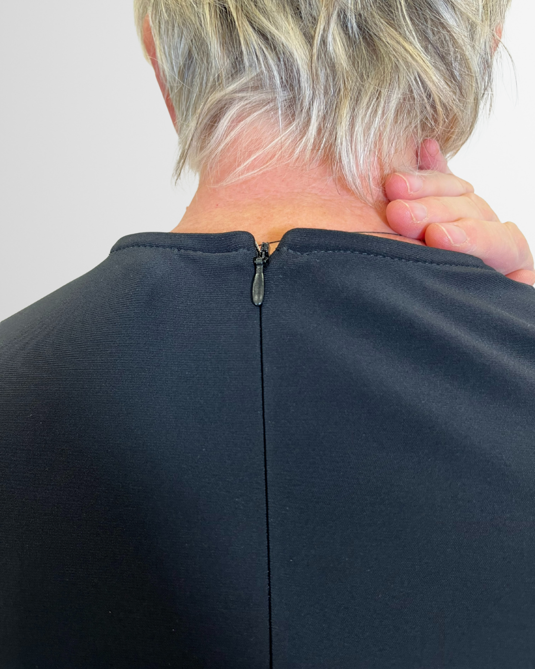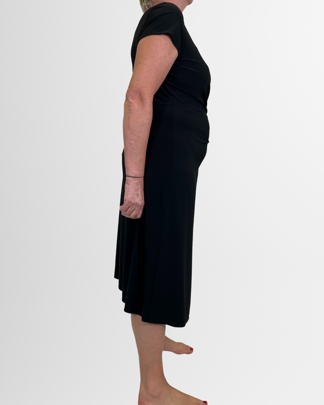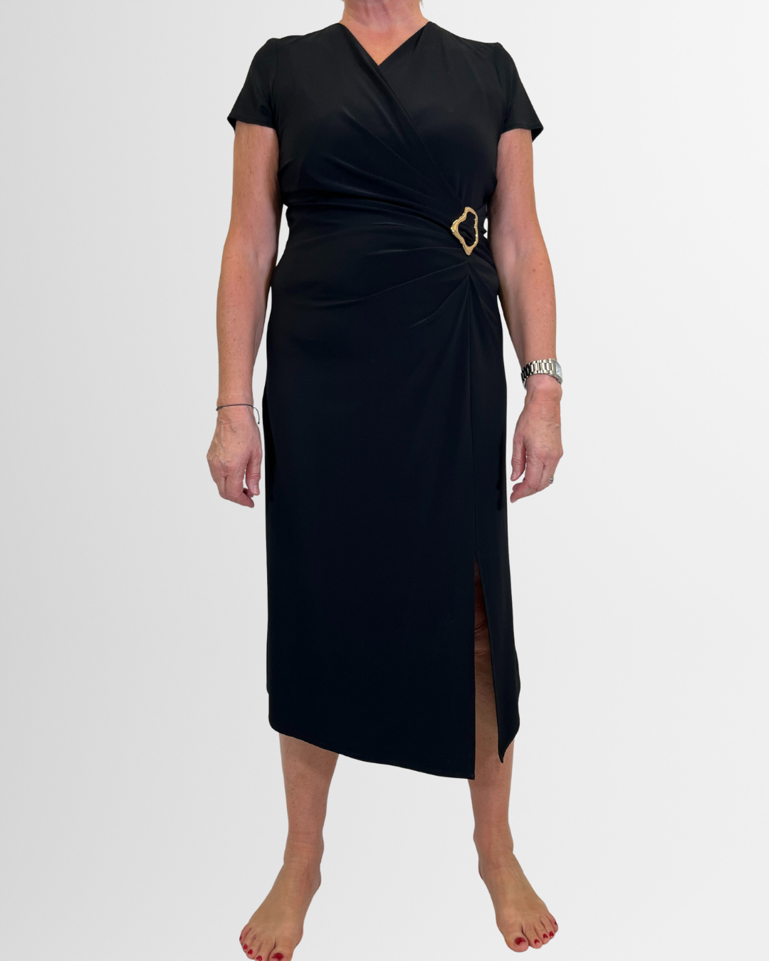 Abito nero a manica corta con incrocio frontale, dettaglio oro e zip sul retro. Elegante e femminile, perfetto per cerimonie o serate.