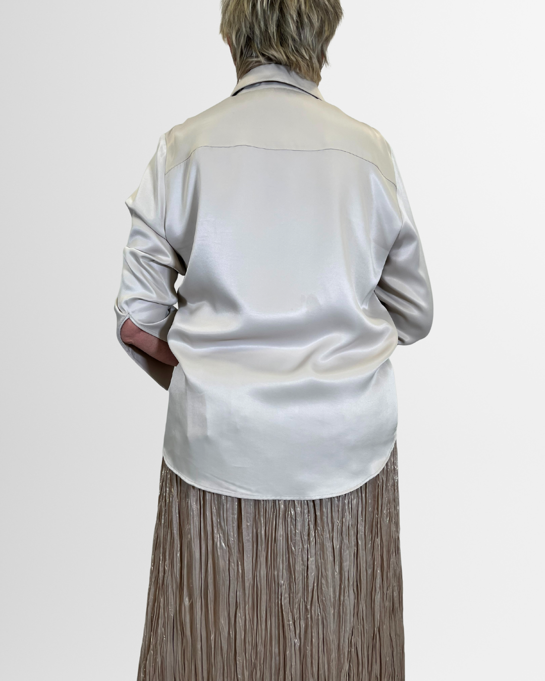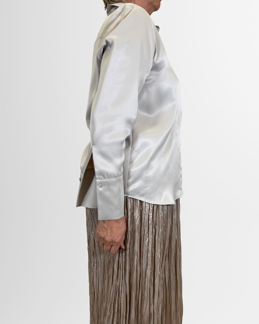 Camicia in raso color ghiaccio con polsini extra alti. Raffinata e chic, perfetta per look eleganti e di tendenza.