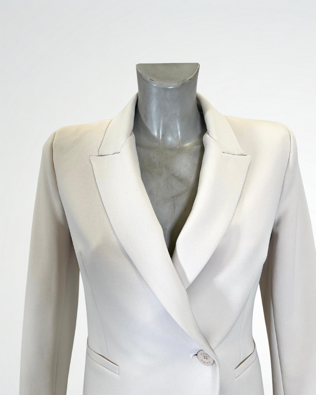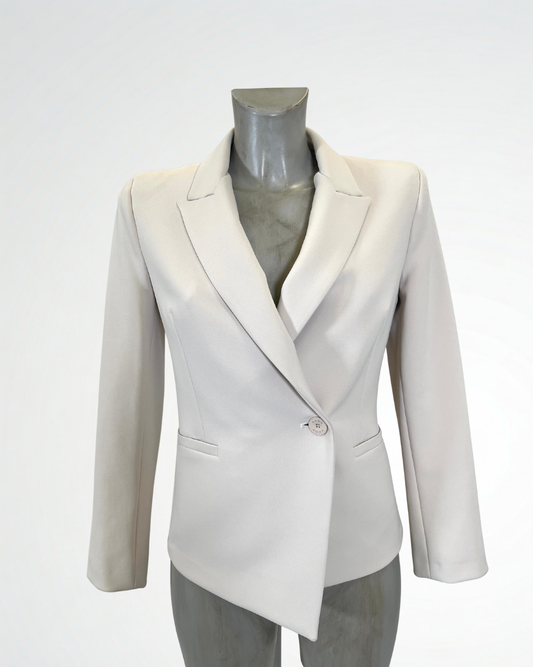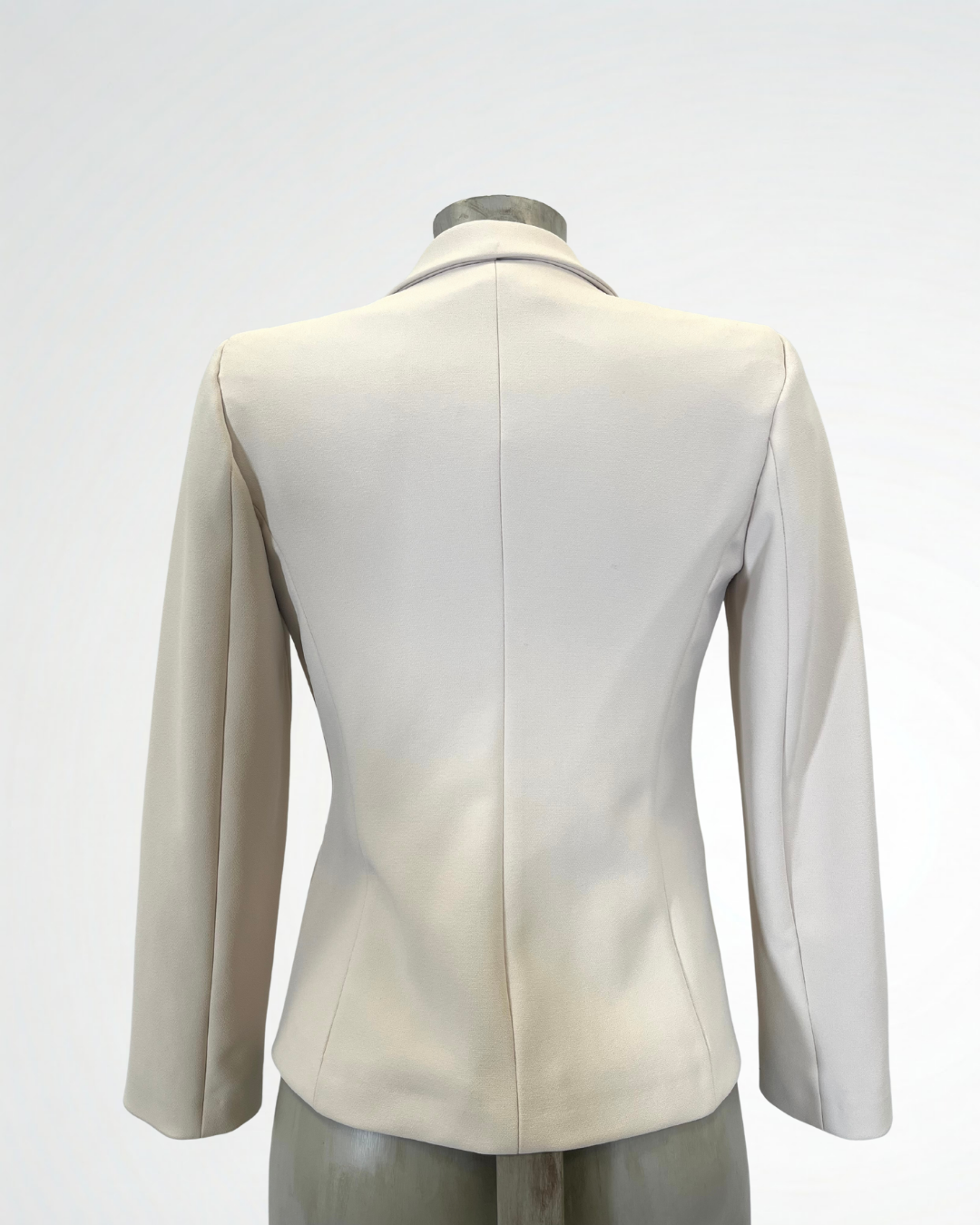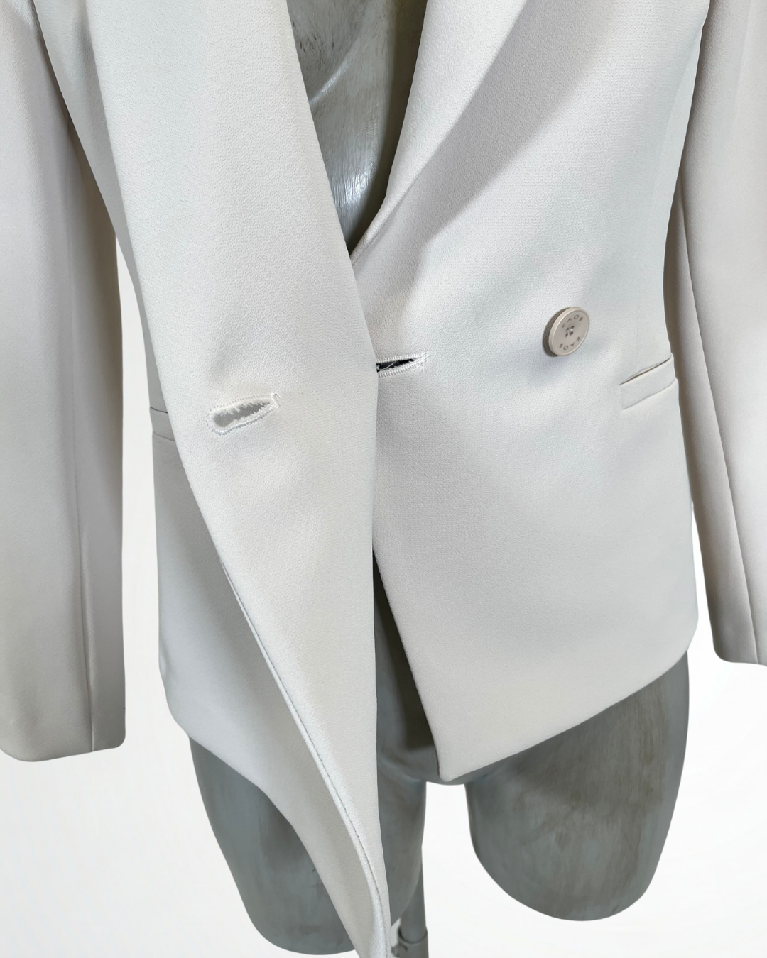 Giacca doppio petto burro con spalline imbottite. Vestibilità slim, perfetta per un look elegante e strutturato.