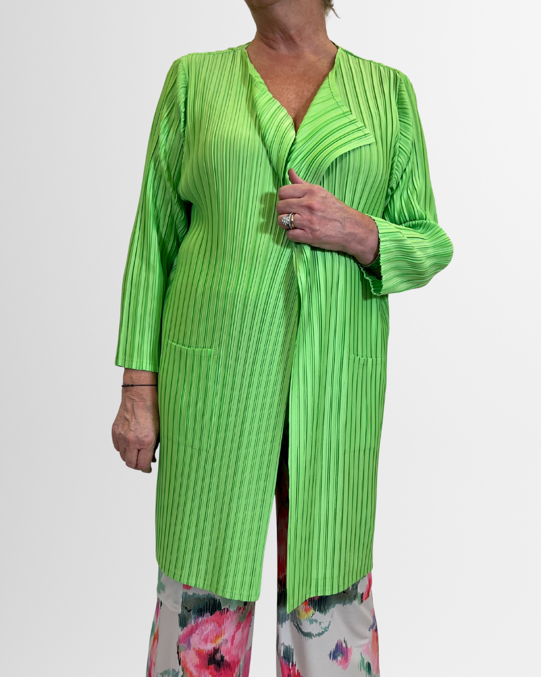 Giacca aperta con tasche e motivo plissettato. Manica lunga, elegante e versatile per un look raffinato e grintoso