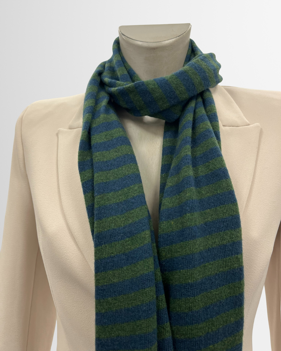 Sciarpa La Nina Loca in 40% cashmere e 30% lana, fatta a mano in Italia. Fantasia a righe verdi e blu, calda e raffinata.