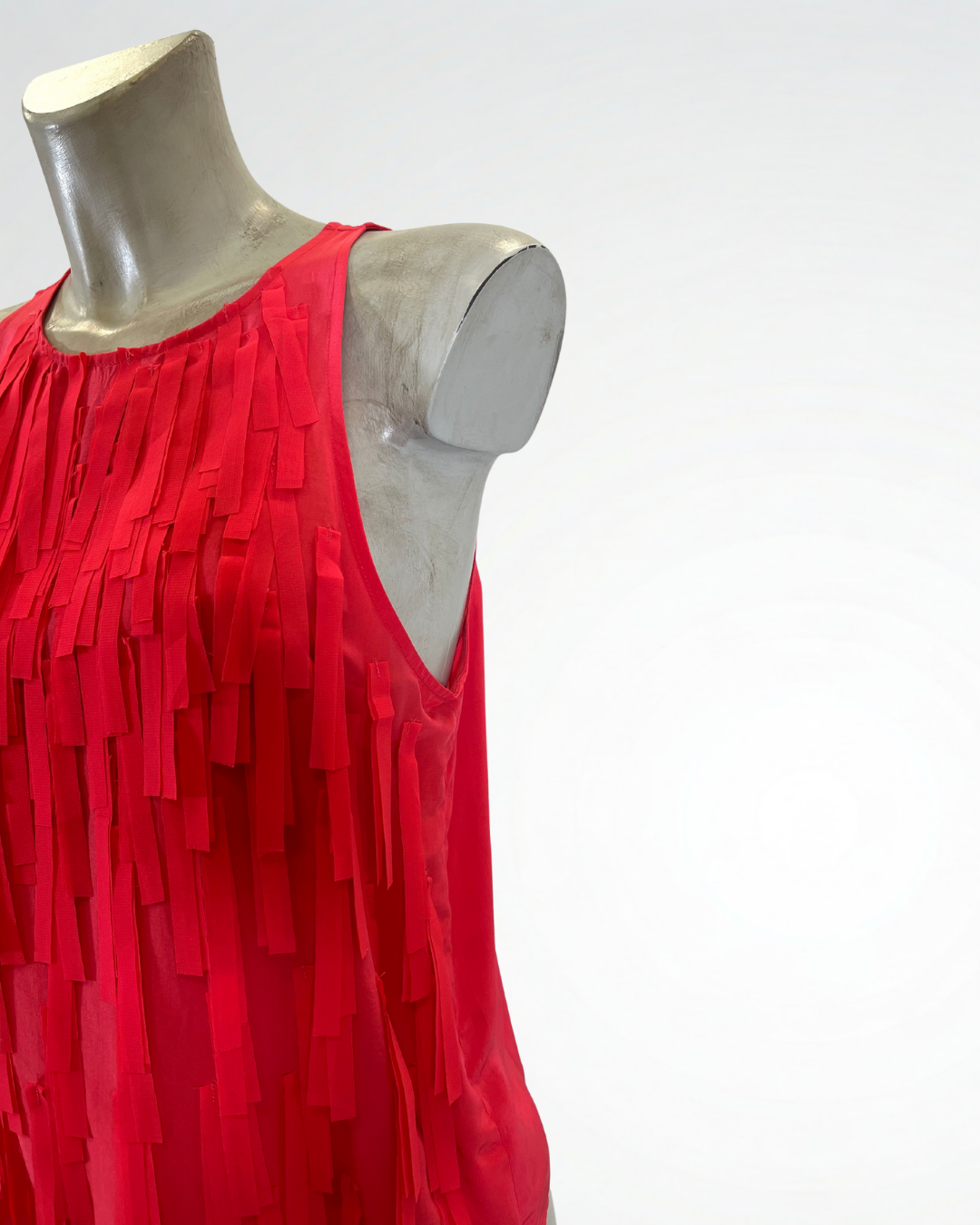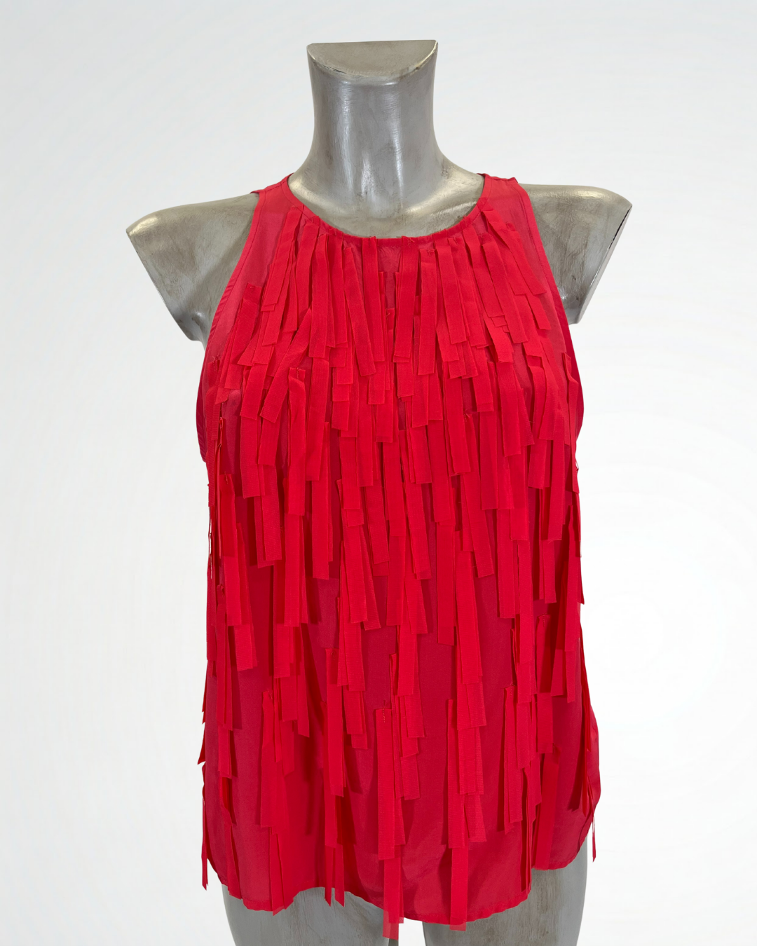 Top senza maniche con applicazioni di frangia sul davanti. Chiusura con bottone dietro al collo, un dettaglio elegante per un capo fresco e originale.
